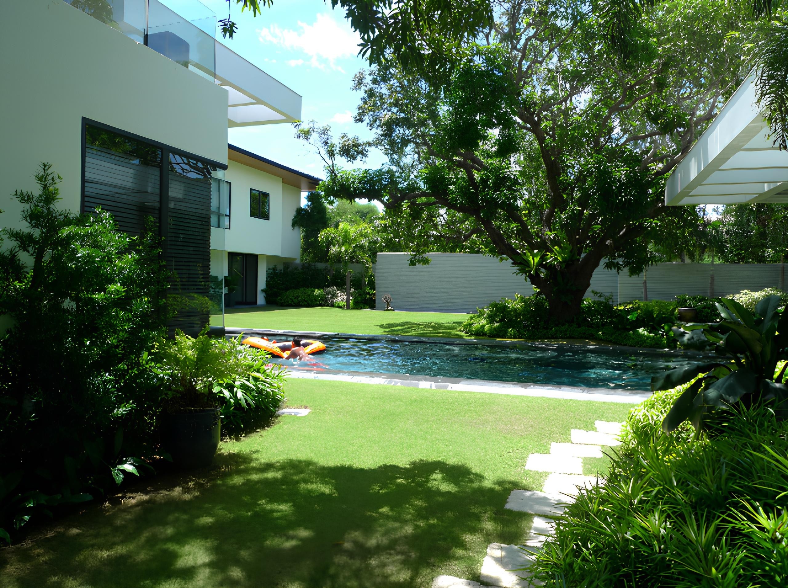 A home shaped by water, gardens, and calm geometry.