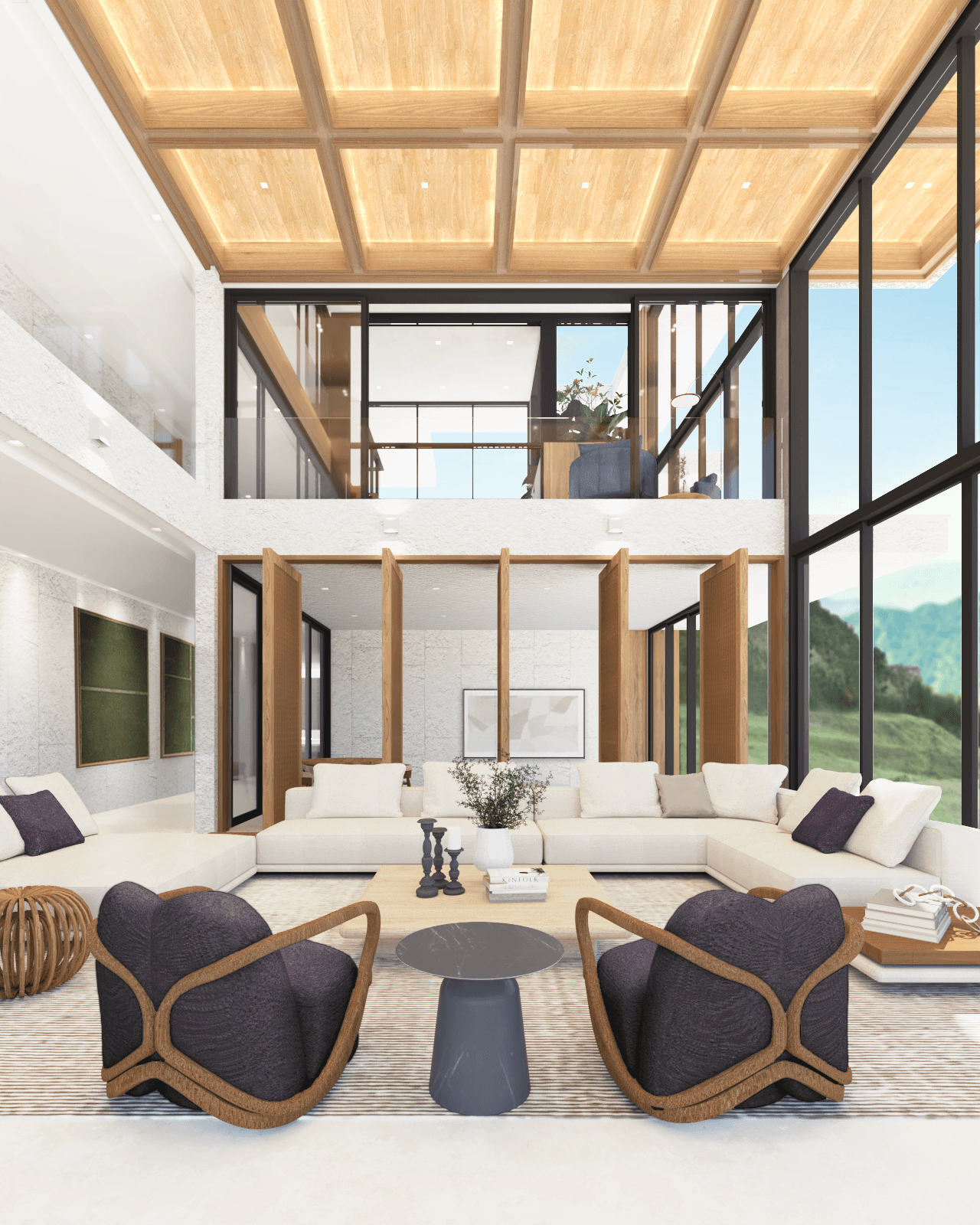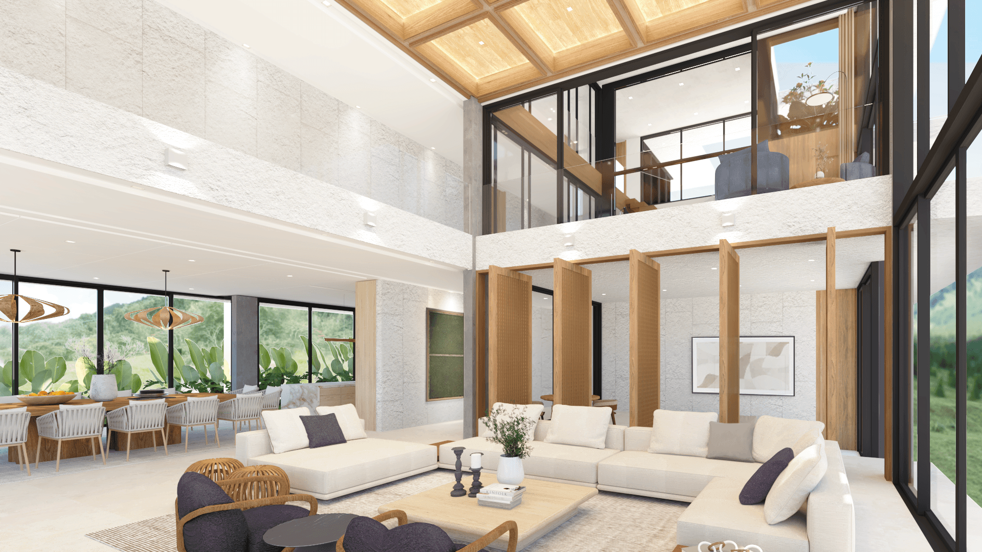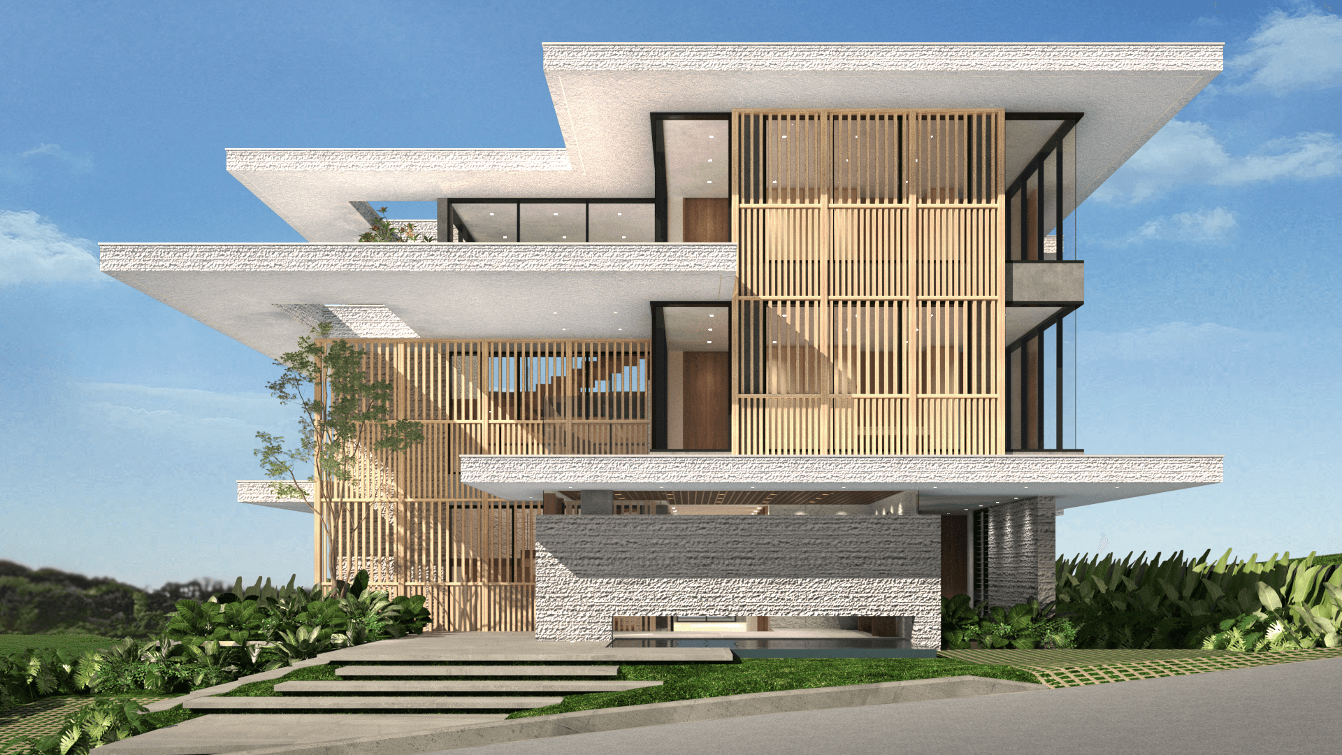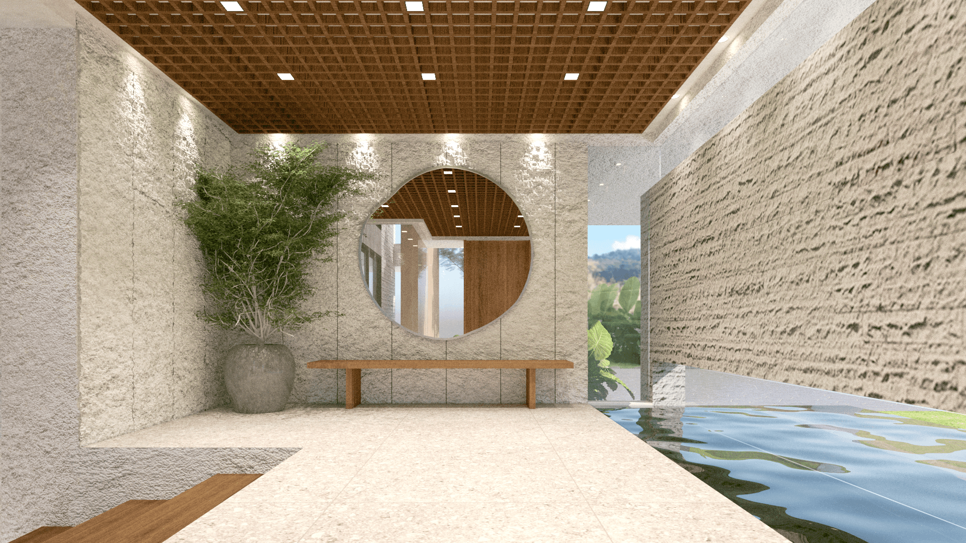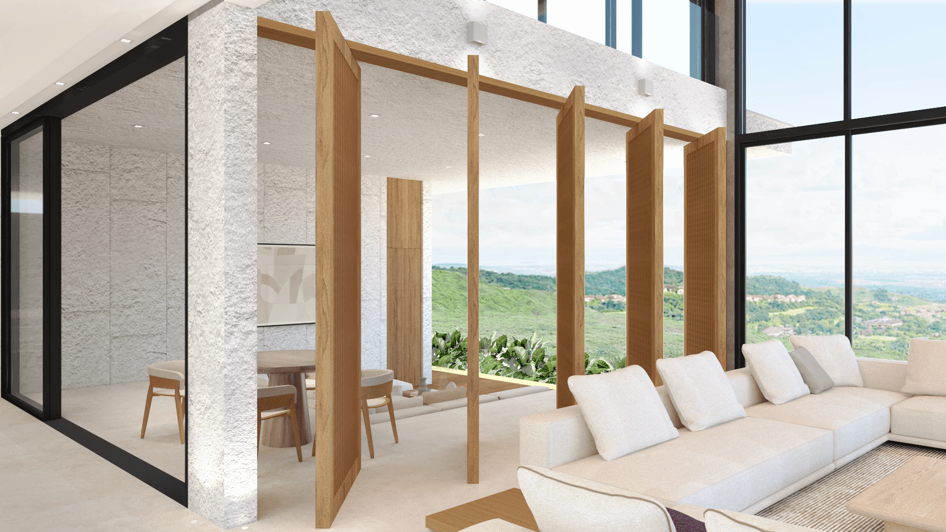 A sloping rest house with layered terraces, warm wood screens, and rugged white stone walls.