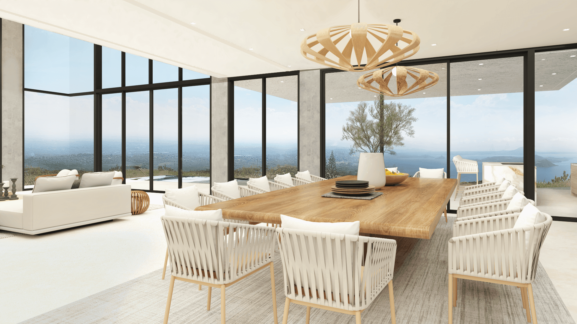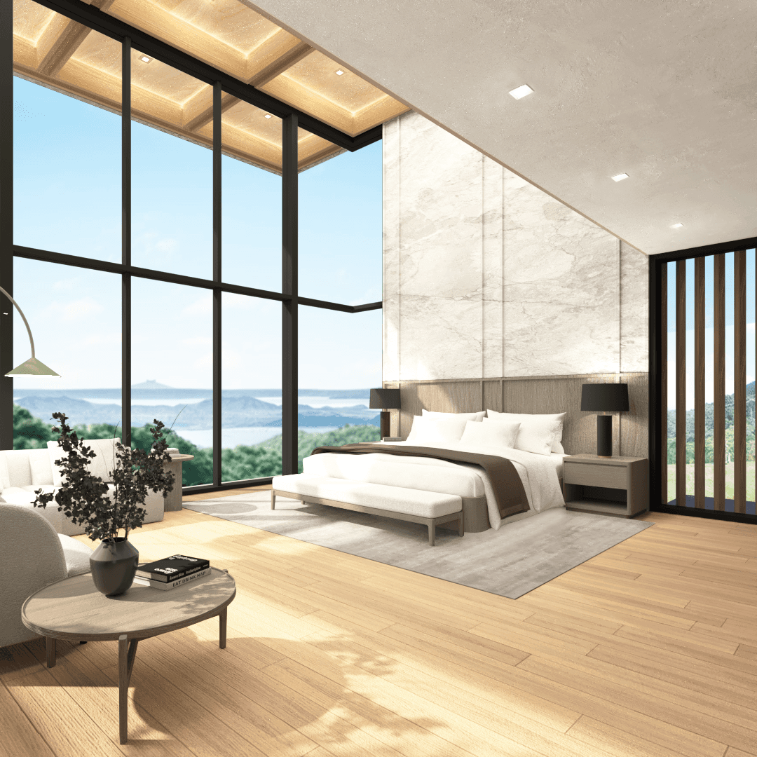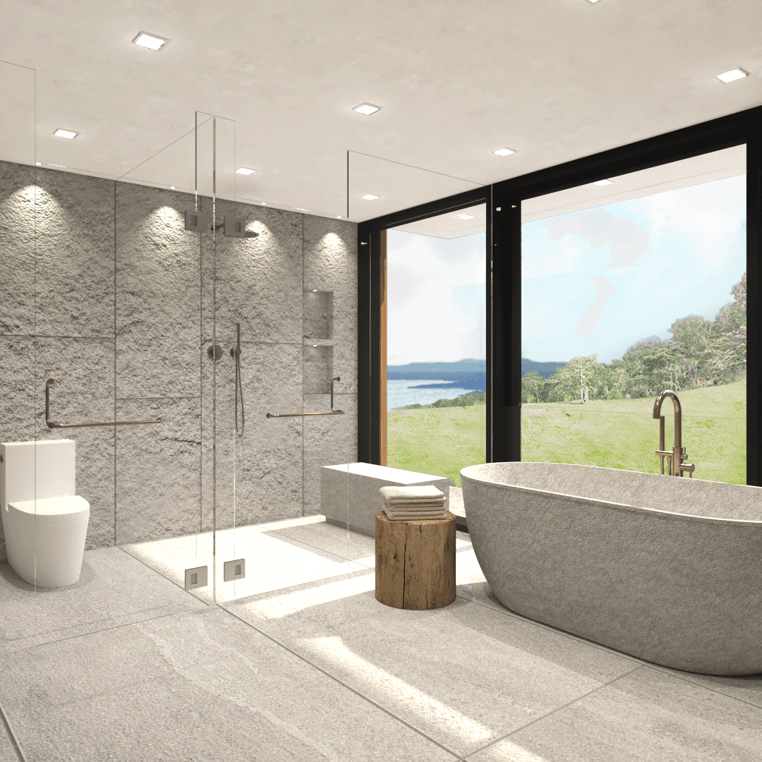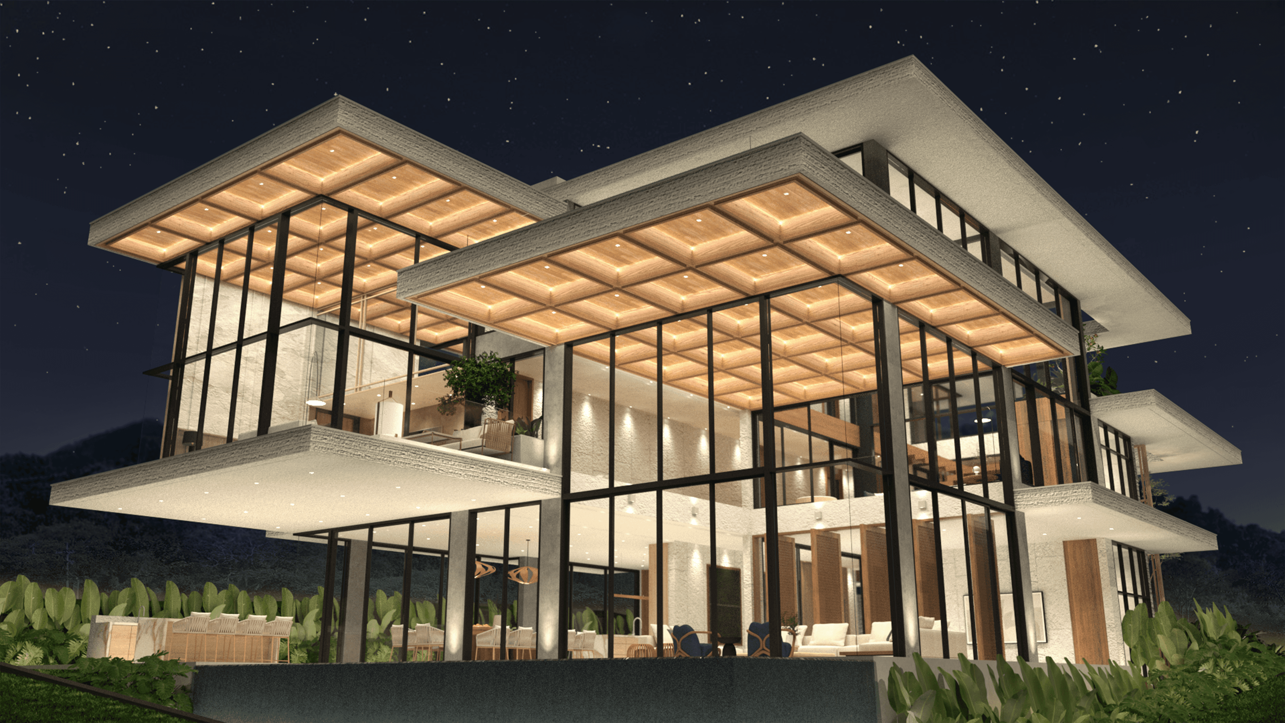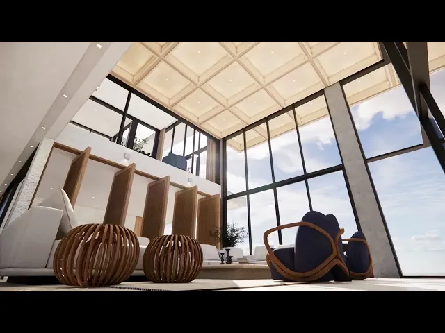 A sloping rest house with layered terraces, warm wood screens, and rugged white stone walls.