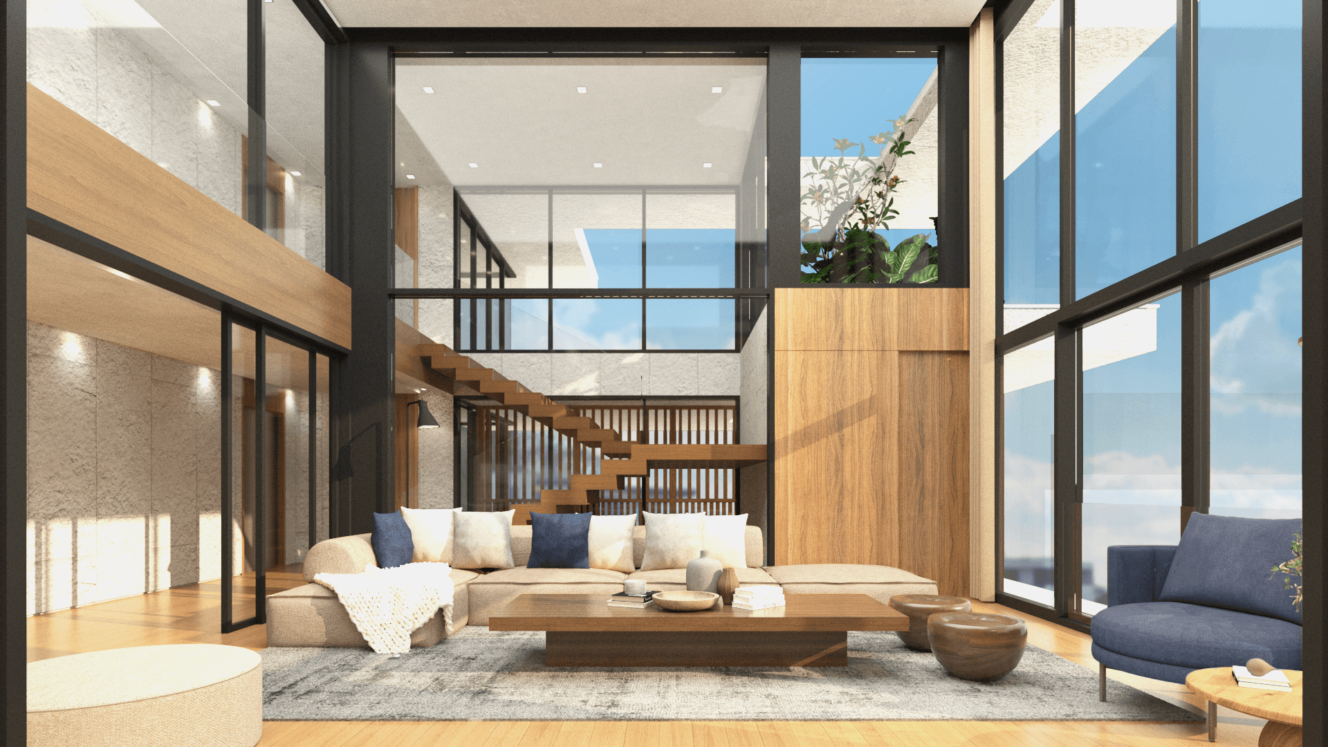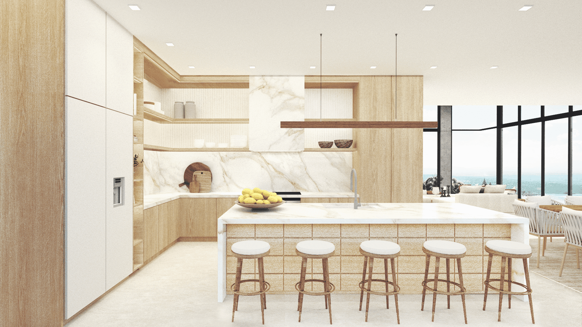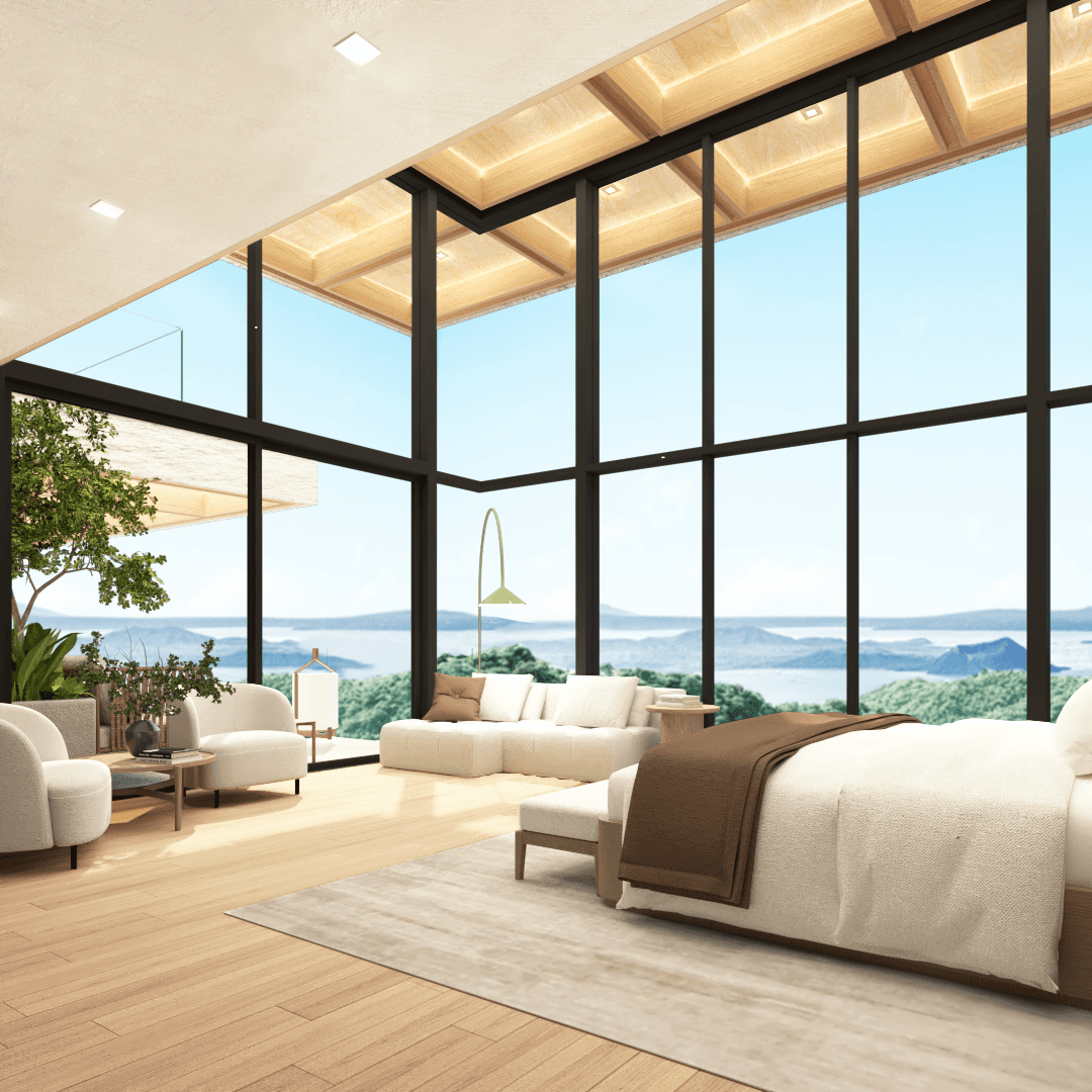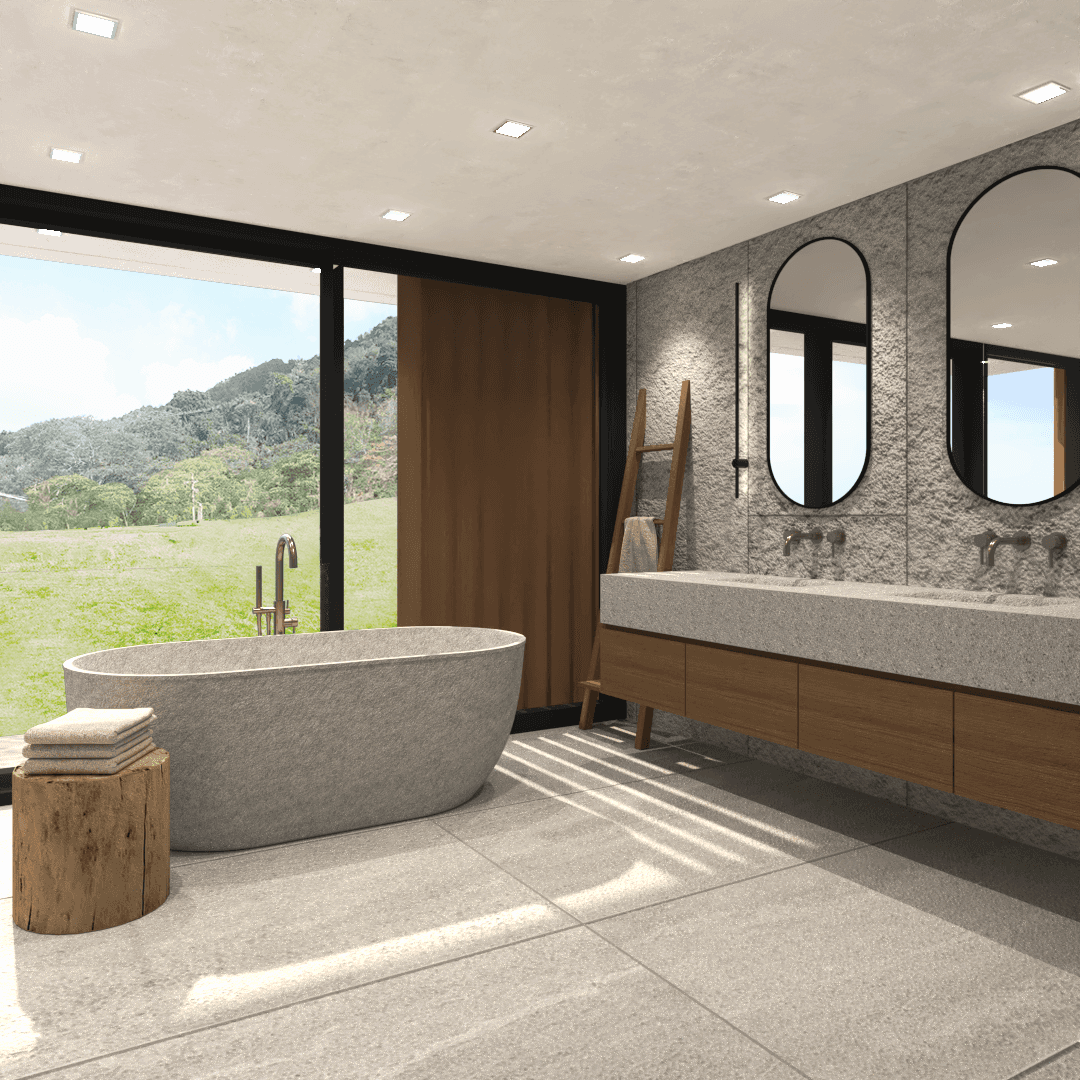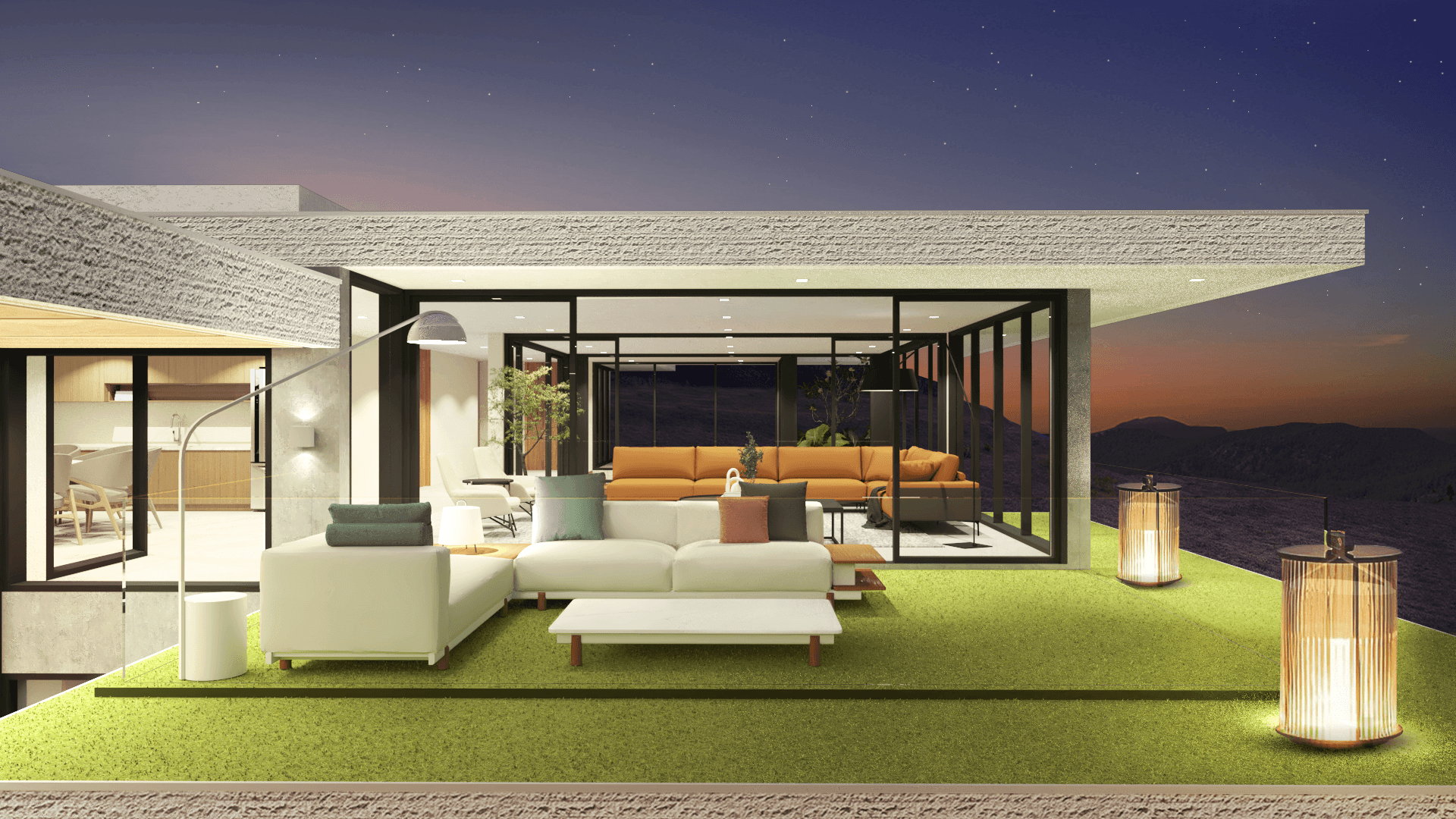 A sloping rest house with layered terraces, warm wood screens, and rugged white stone walls.