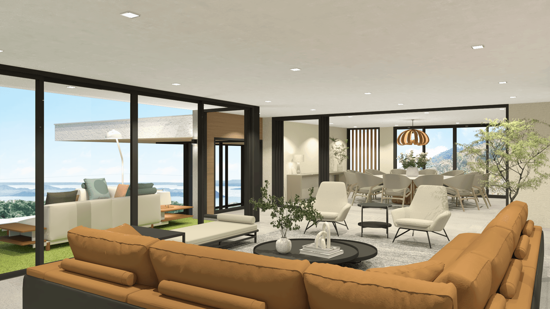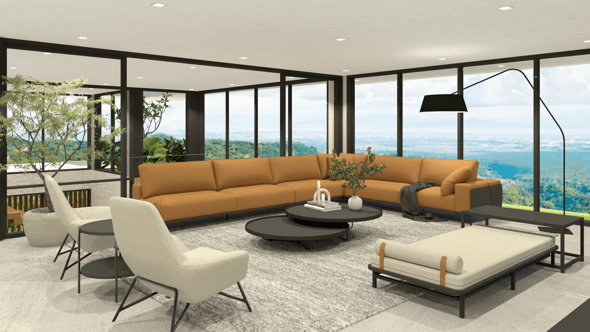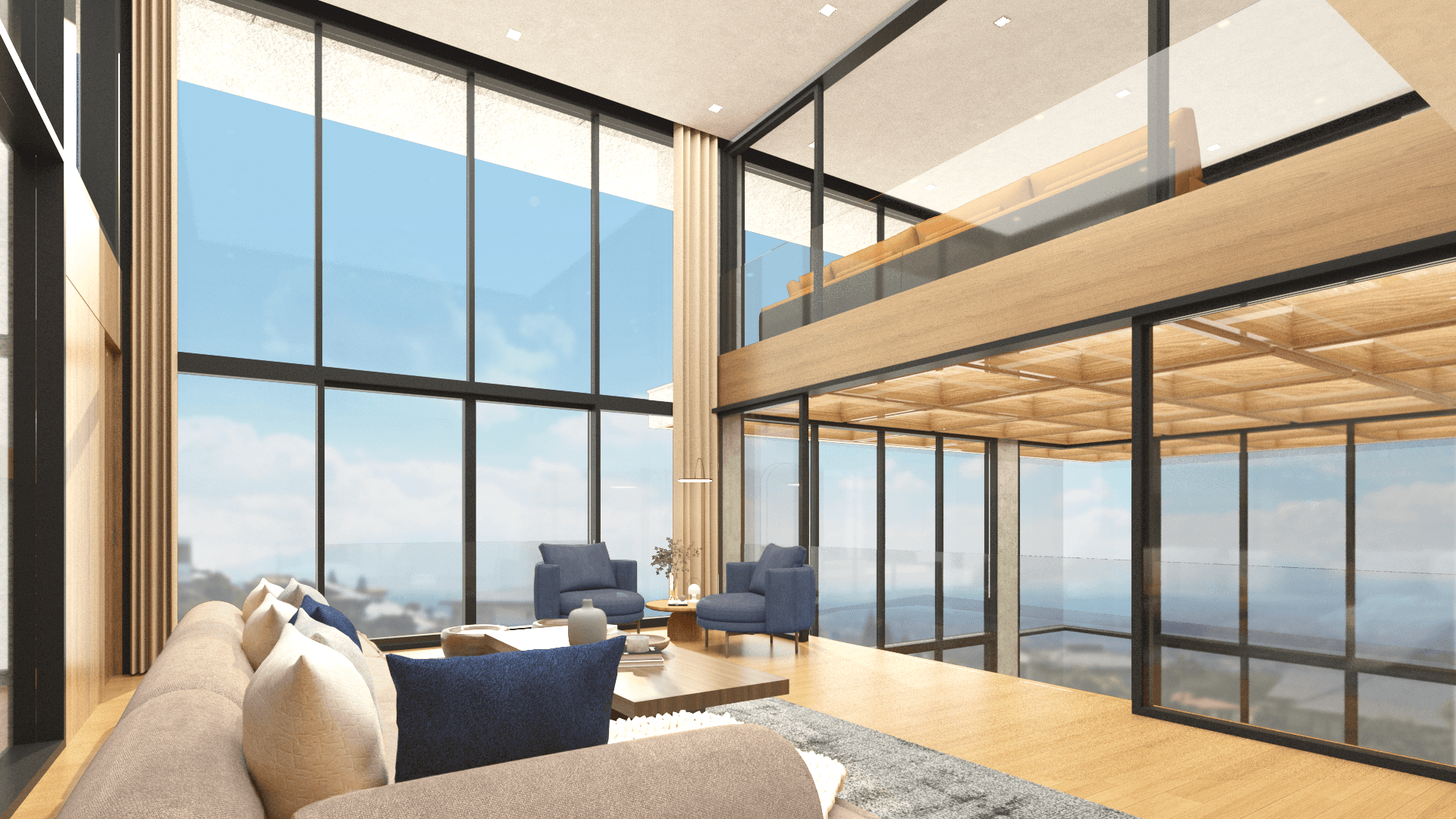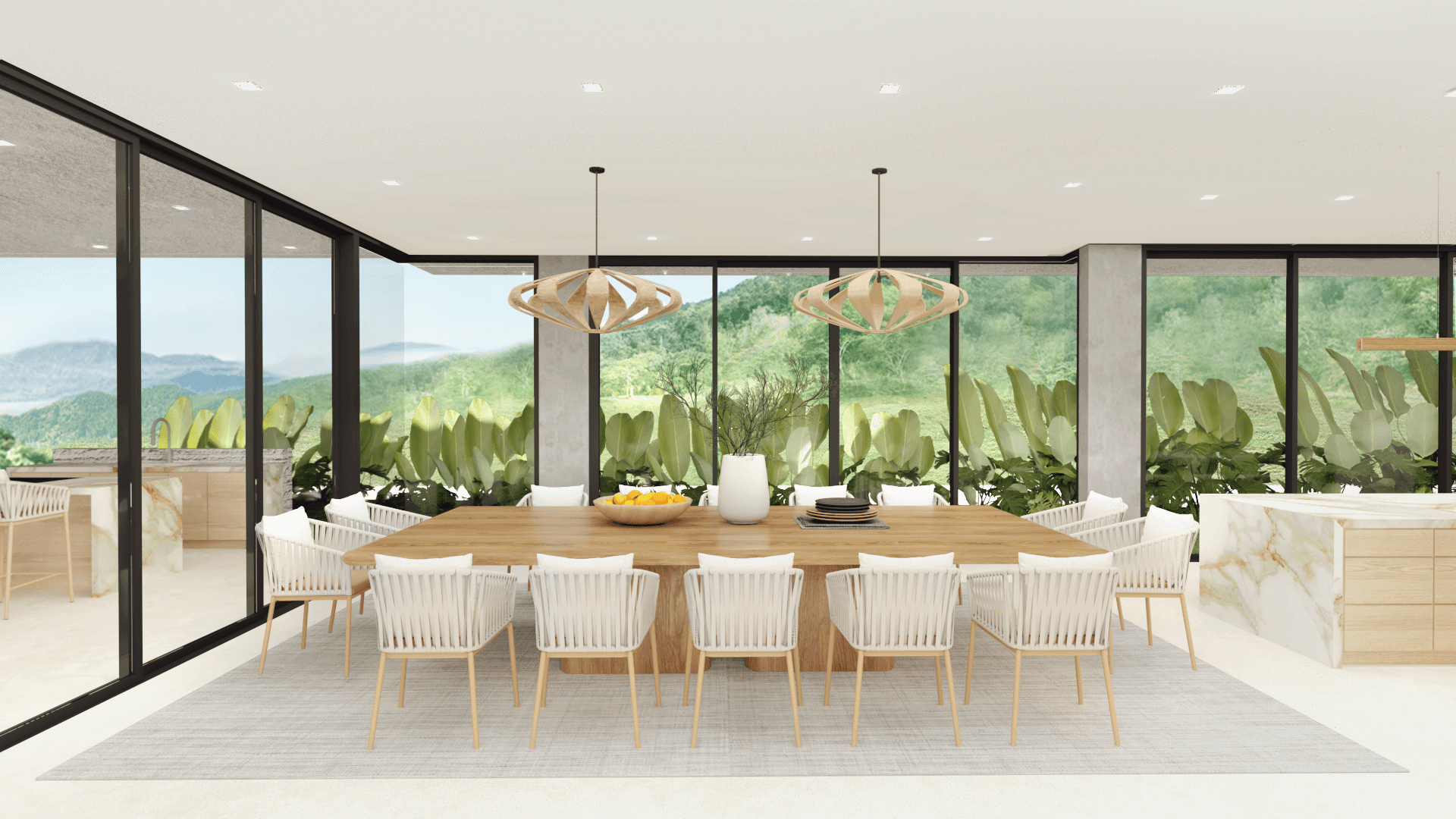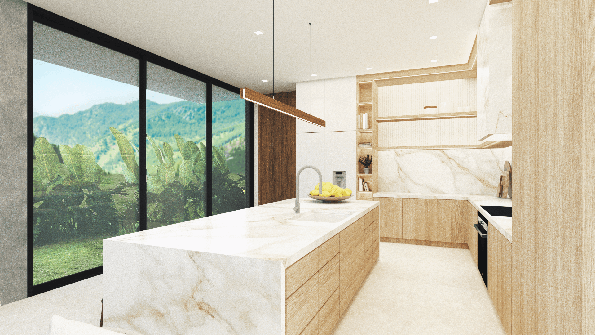 A sloping rest house with layered terraces, warm wood screens, and rugged white stone walls.