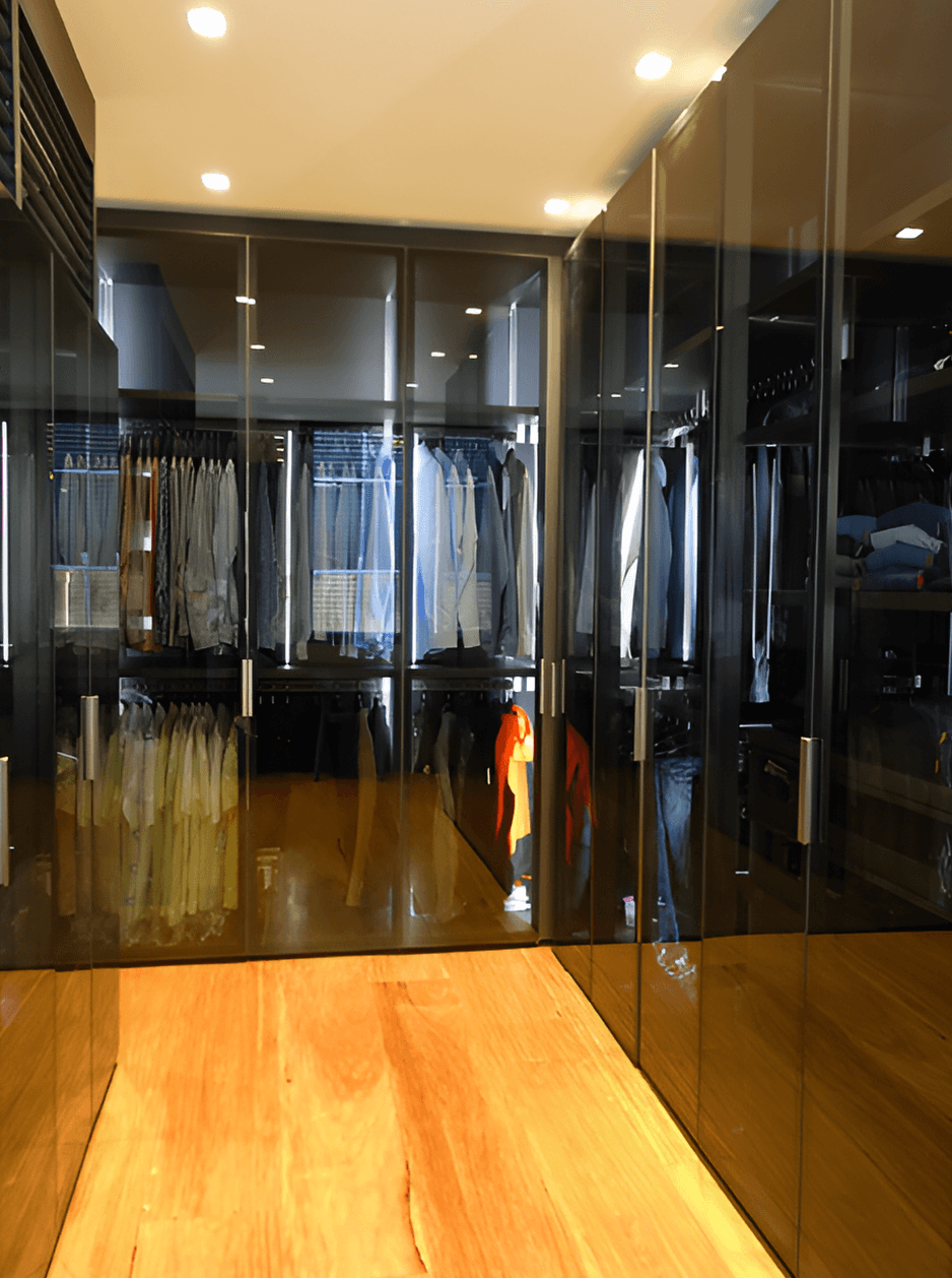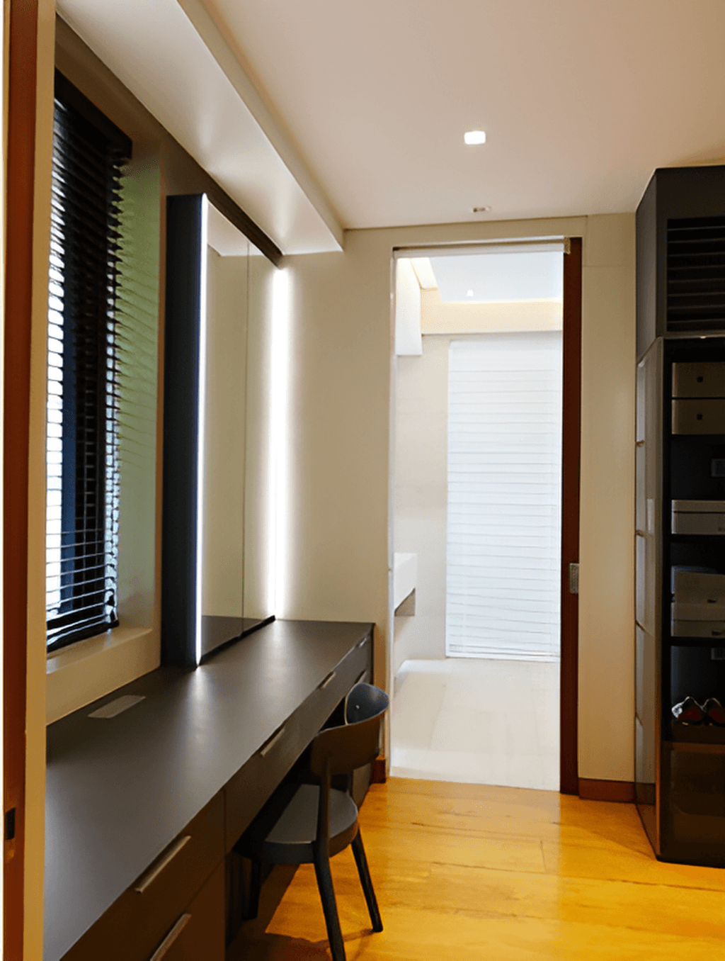 The walk-in closet is conceived not as storage, but as transition. Darker tones and reflective surfaces slow the pace, turning routine into ritual. A built-in vanity provides a moment to pause before the day begins or gently winds down.
