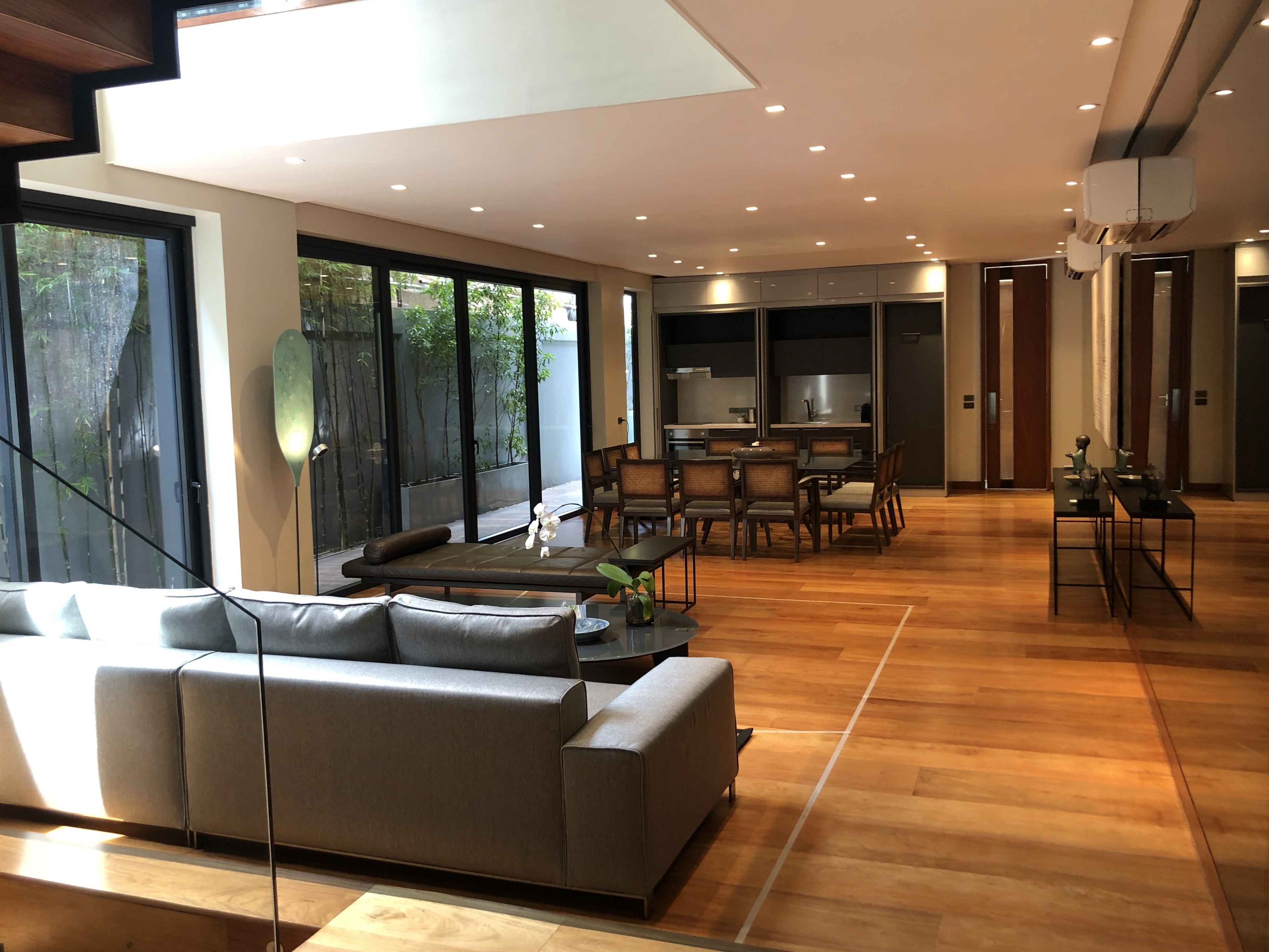 The ground floor opens into a continuous living, dining, and kitchen space, designed for both gathering and quiet evenings at home. Sliding glass panels dissolve the boundary to the garden, extending daily life outward.