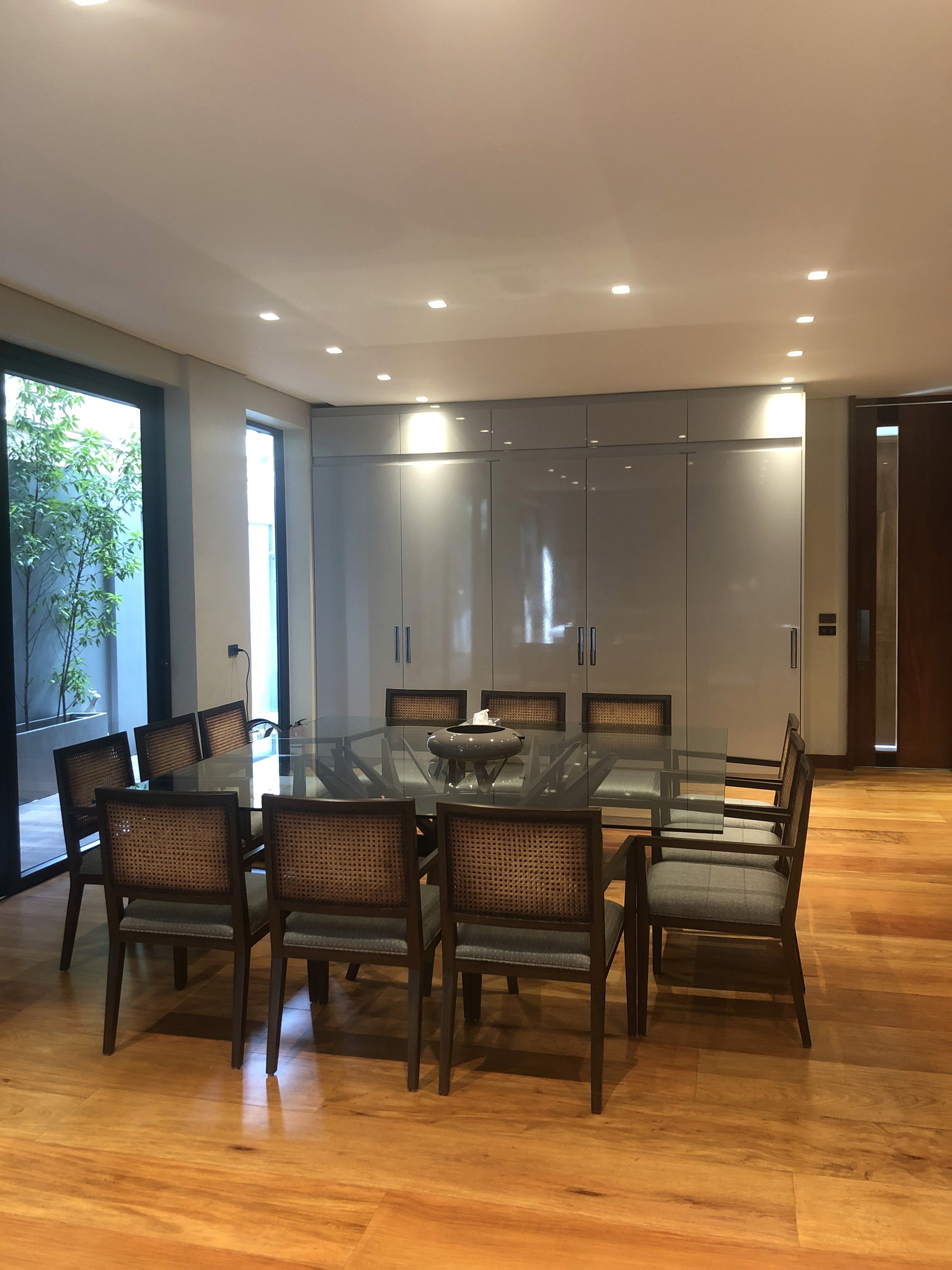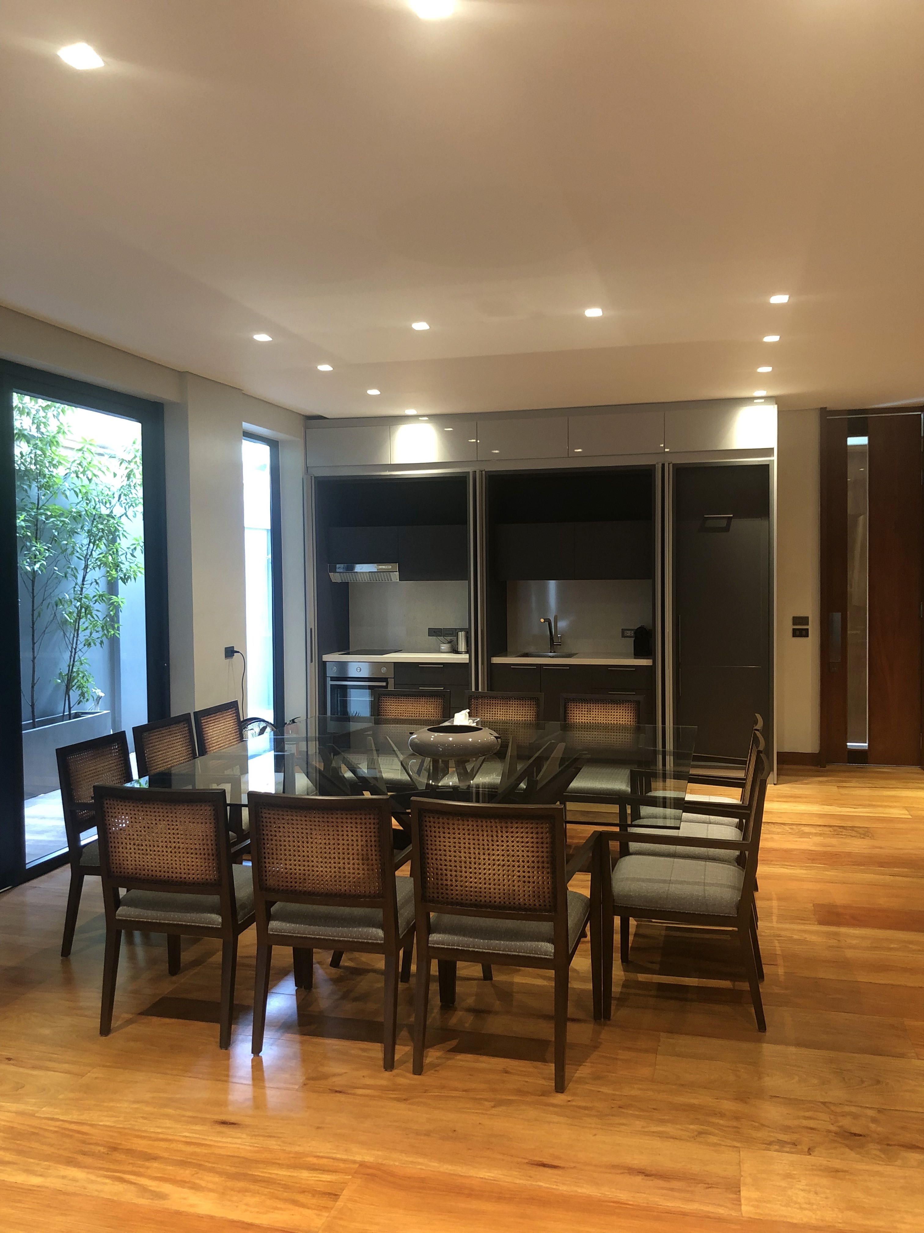 At the center of the home, the dining area anchors everyday rituals. The kitchen, concealed behind custom folding and sliding panels, reveals itself only when needed.