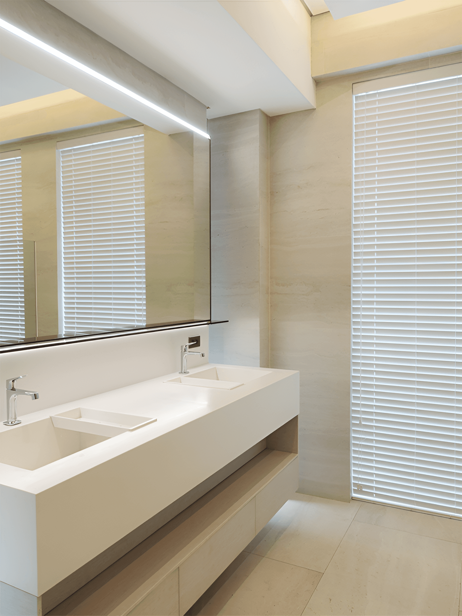In the master bath, light takes center stage. Pale stone surfaces reflect daylight softly, while integrated lighting eliminates visual noise. Fixtures remain understated, allowing proportion and material to shape the experience.