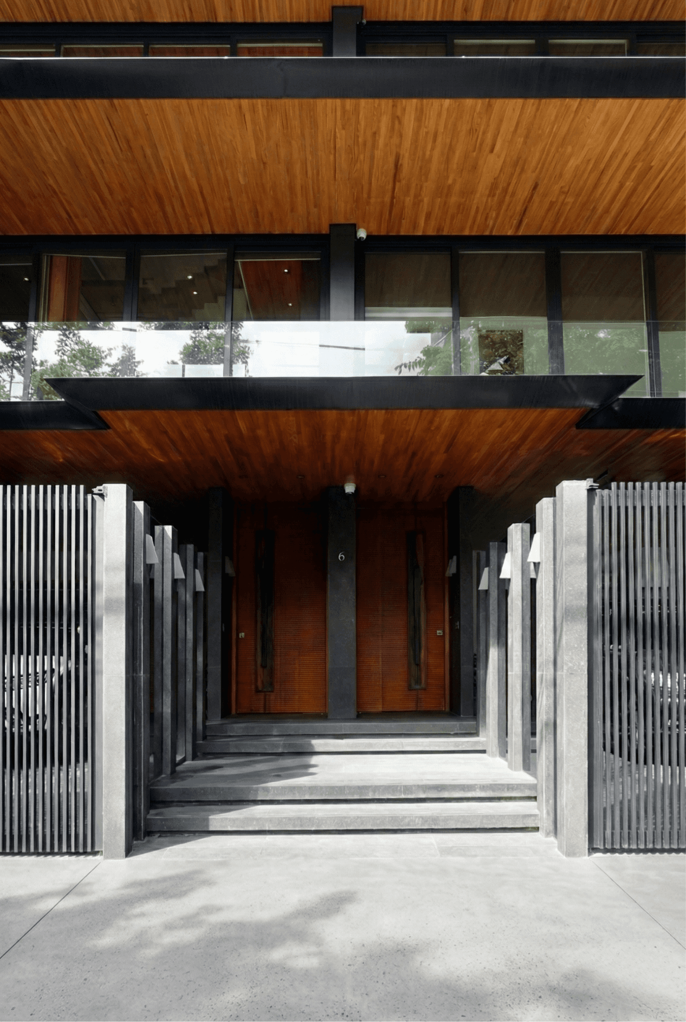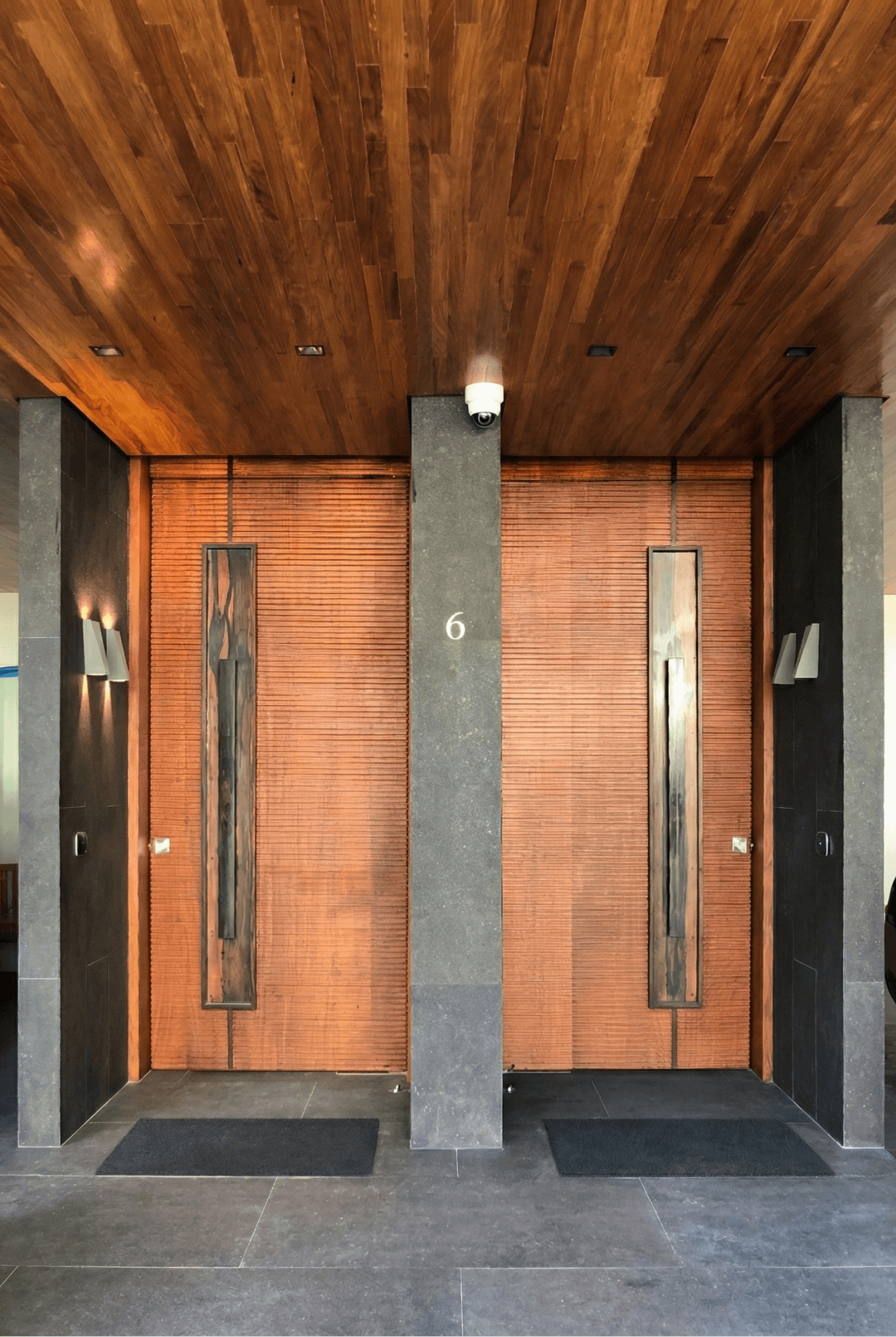 Arrival is marked by a gentle pause. A solid wood door, carved from a single piece, welcomes you with texture and weight. Horizontal grooves follow the grain continuously from top to bottom, allowing the wood to express its natural movement.
