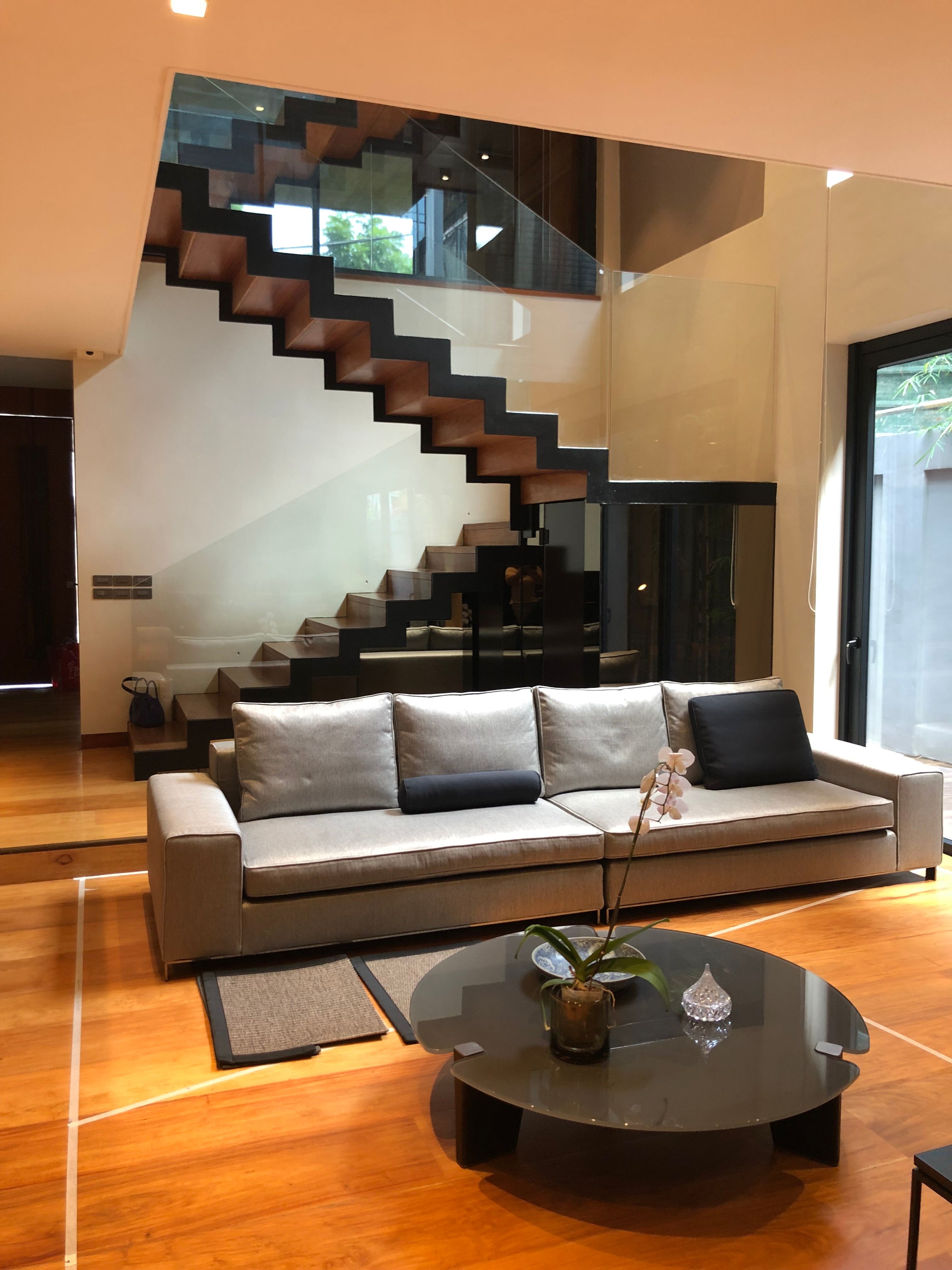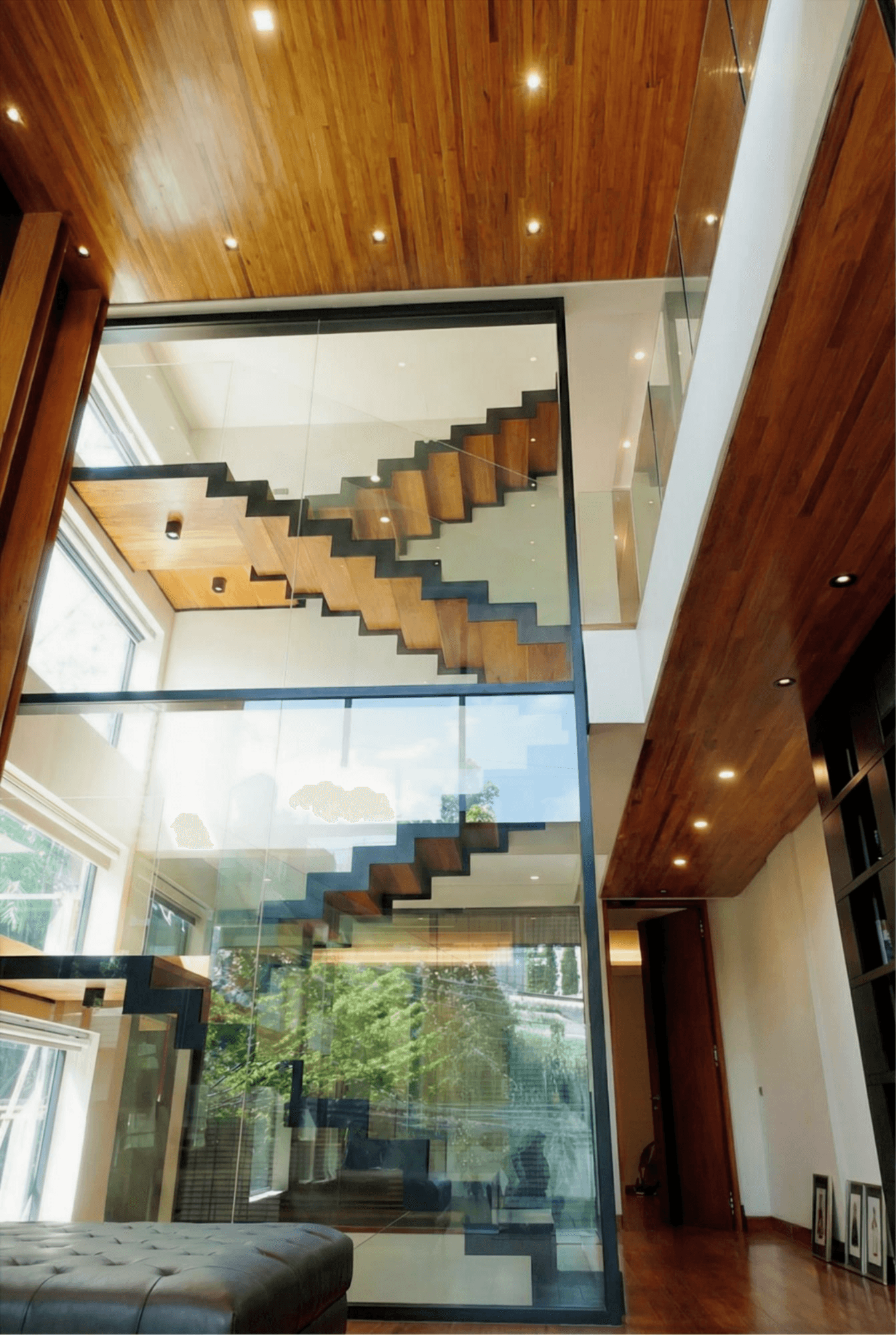 At the heart of the home, the staircase becomes a quiet moment of wonder. Thin steel profiles give structure, while narra wood softens every step. Glass balustrades allow light to pass freely, so movement through the house is always accompanied by shifting shadows and reflections.
