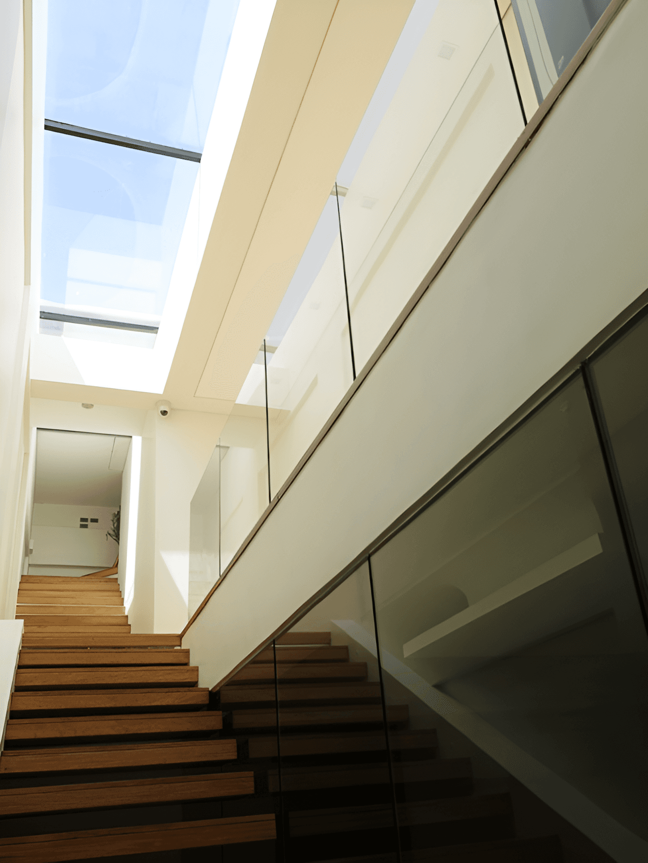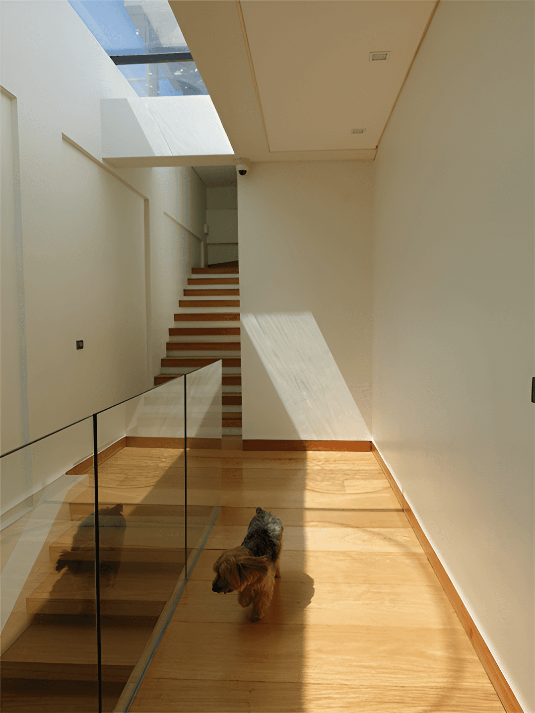 Ascending through the house, the stair becomes a companion once more. Cantilevered treads appear to float alongside a glass wall, while a skylight above draws daylight deep into the home.
