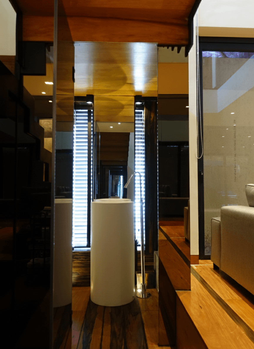 Smaller spaces are treated with the same care as larger volumes. Beneath the stair, the powder room becomes an intimate pause: a kamagong inlay guiding the eye, a freestanding vessel softly lit, a full-height mirror reflecting warmth and movement.